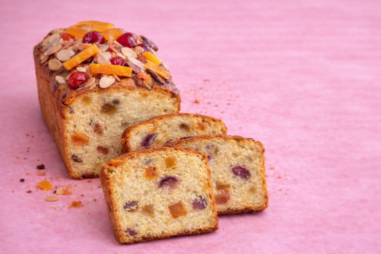 Un cake moelleux et parfumé, généreusement garni de fruits confits fondants pour un plaisir gourmand et coloré à chaque bouchée.