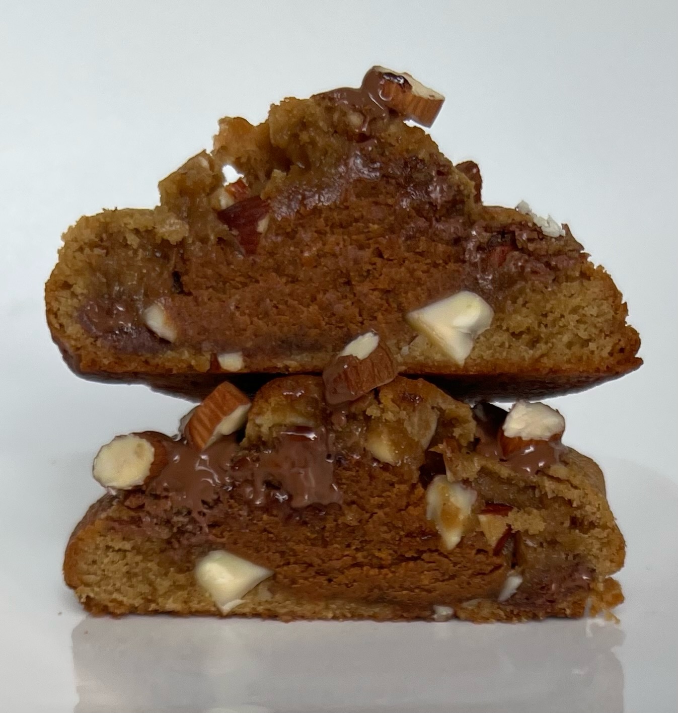 Découvrez notre Crunchy Almond Cookie, une création au pur beurre, subtilement garnie d’éclats d’amandes croquantes et de chocolat au lait fondant. En son cœur, un praliné amande généreux vient apporter toute la douceur et l’intensité de ce fruit sec noble. Un cookie à la fois croustillant, fondant et terriblement addictif, pensé pour les véritables amoureux de l’amande.
